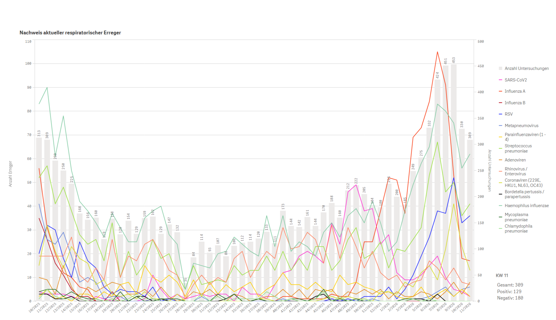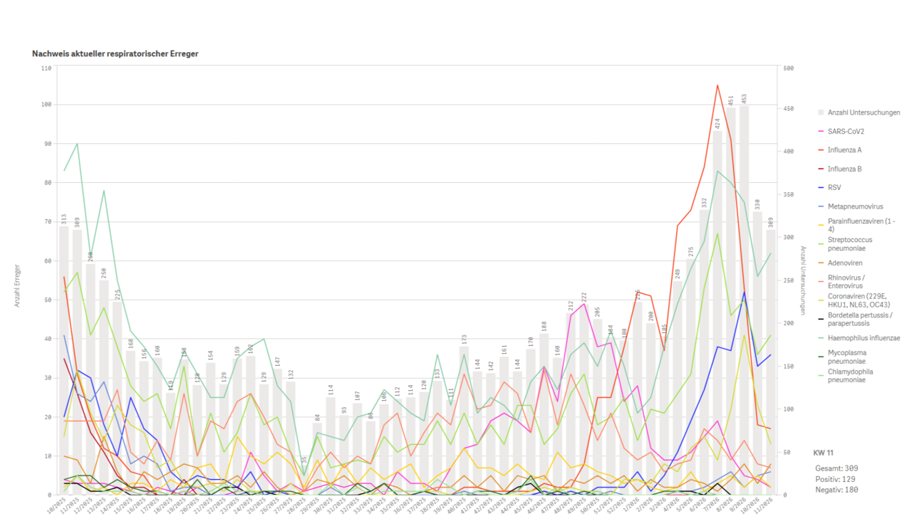 Die Grafik dient der übersichtlichen Darstellung zeitlicher Trends, saisonaler Schwankungen und der parallelen Zirkulation verschiedener respiratorischer Erreger und wird regelmäßig aktualisiert.